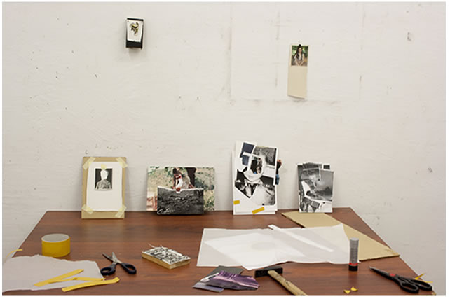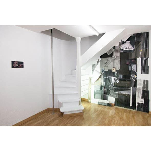 Ante a escena, sobre a mesa, no centro, hai un collage, unha muller cos brazos estendidos coma se suxeitase a imaxe que se lle superpón, mira cara abaixo e atravesa o tempo. Sostén unha reprodución dunha fotografía en branco e negro de soldados mortos, supoñemos que nalgunha batalla, talvez o “Desastre de Annual”. A relación temporal establécese a través do xesto e dunha mancha vermella e branca que vincula os dous tempos que non acaban de tocarse debido a un desgarro no plano.